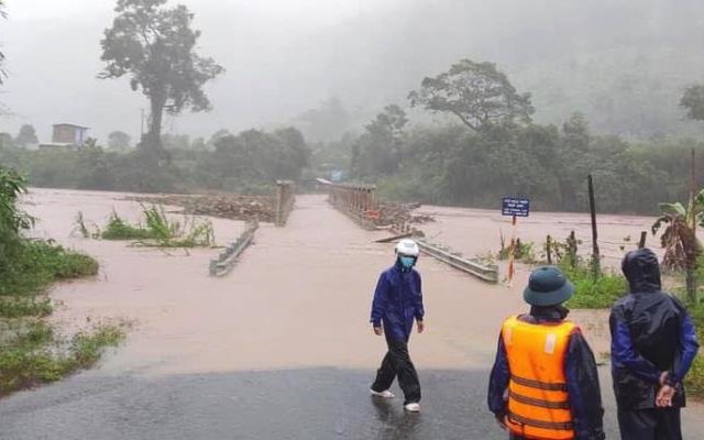 Do ảnh hưởng của bão số 9, mưa lớn kéo dài khiến mực nước lũ trên sông dâng cao làm cây cầu dân sinh xã Đăk Pne bị cuốn trôi, hàng nghìn người dân bị cô lập.
