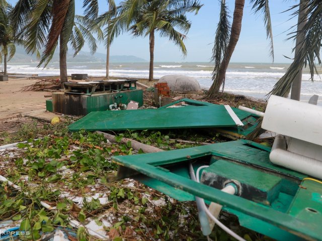 Hàng dừa, phi lao, bờ kè bị gió quật ngã, nhiều công trình công cộng ở các bãi tắm Phước Mỹ, Phạm Văn Đồng... hư hại sau bão Molave.