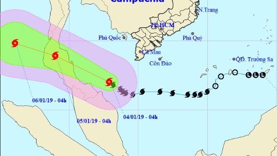 Bão Pabuk hiện cách mũi Cà Mau khoảng 260km về phía Tây Nam, sức gió mạnh nhất vùng gần tâm bão mạnh cấp 9 75-90km/giờ, giật cấp 12.