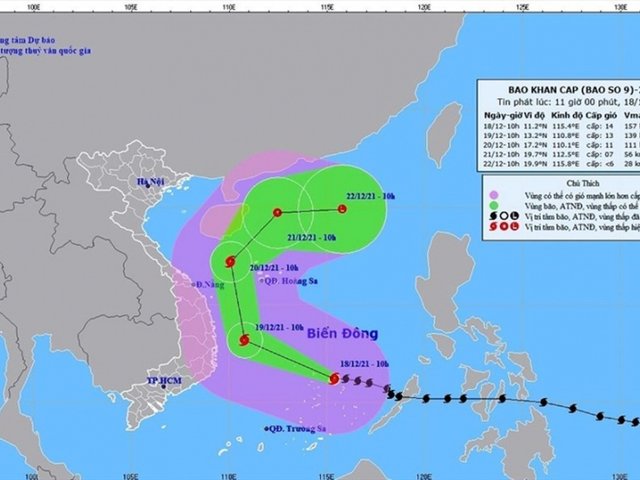 Chiều 18/12, tâm bão RAI (bão số 9) cách Bình Định khoảng 615km, cách Khánh Hòa khoảng 580km, sức gió mạnh nhất gần tâm bão mạnh cấp 14-15, giật cấp 17.