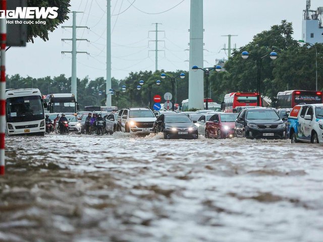 Hoàn lưu bão số 10 gây mưa lớn tại Hà Nội, nhiều tuyến đường biến thành sông, xe chết máy la liệt khiến dòng người nối đuôi nhau dắt bộ qua đoạn ngập.