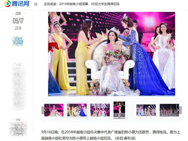 Trên các trang báo tiếng Trung, có nhiều bình luận, nhận xét về nhan sắc của tân Hoa hậu Việt Nam 2018 Trần Tiểu Vy, đặc biệt còn so sánh cô với Hoa hậu Hong Kong cũng mới vừa đăng quang.