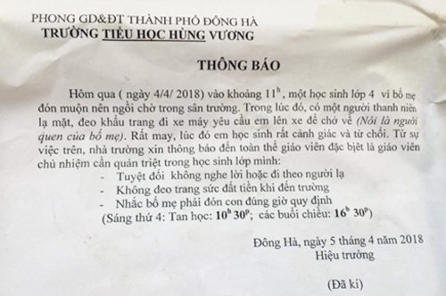 Sau phản ánh của nữ sinh có người đàn ông lạ đến đón, buộc em phải bỏ chạy, Trường Tiểu học Hùng Vương đã thông báo tới toàn trường.