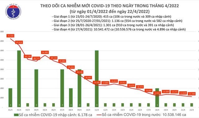 Theo công bố từ Bộ Y tế, ngày 22-4, cả nước ghi nhận 11.160 ca Covid-19 mới, trong đó, không còn tỉnh, thành phố nào ghi nhận từ 1.000 ca Covid-19 trở lên...