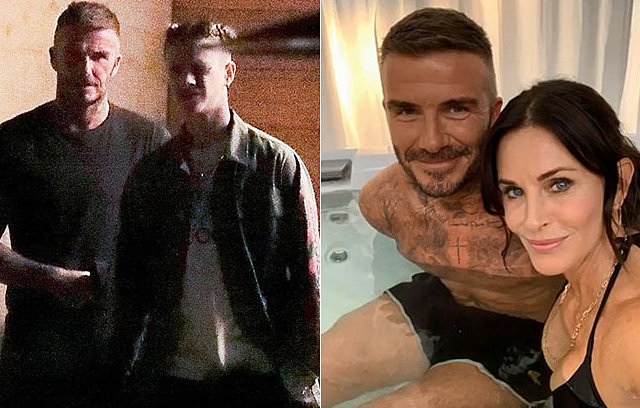 Cựu danh thủ David Beckham cùng gia đình thưởng thức bữa tối ở Malibu tối 25/10, ít giờ sau khi bức ảnh ngồi chung bồn tắm với diễn viên Courteney Cox trở thành đề tài bàn tán.