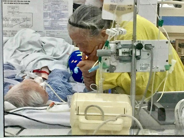 Bức ảnh tuyệt đẹp được chụp tại BV Phổi TƯ. Cụ bà gần 90 tuổi nắm chặt tay cụ ông, thủ thỉ và tay cụ ông chạm vào má vợ dù đang phải thở máy.