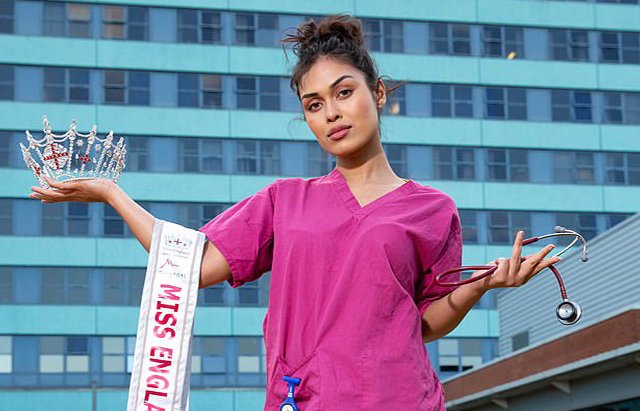 Bhasha Mukherjee - Miss England 2019 - xin hoãn các hoạt động của hoa hậu, về bệnh viện Pilgrim tại Boston chống Covid-19.
