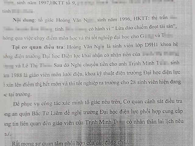 Cơ quan Cảnh sát điều tra Công an quận Bắc Từ Liêm (TP.Hà Nội) đang xác minh đơn tố cáo, tố cáo hành vi nhận tiền để chạy điểm môn học và thi tốt nghiệp của giảng viên trường Đại học (ĐH) Điện lực.