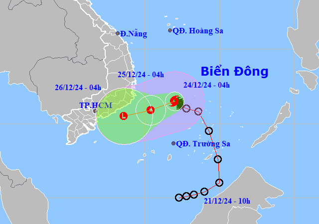 Đến rạng sáng mai 25/12, vị trí tâm áp thấp nhiệt đới ở trên vùng biển từ Khánh Hòa đến Bình Thuận với sức gió mạnh nhất vùng tâm áp thấp nhiệt đới cấp 6-7, giật cấp 9.