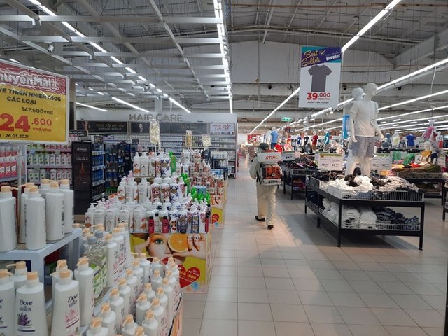 Lực lượng chức năng phun khử khuẩn, trích xuất camera siêu thị Big C Thăng Long (quận Cầu Giấy) để tìm người tiếp xúc với ca nghi mắc Covid-19.