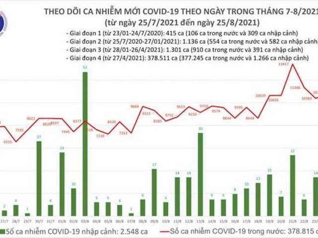 Tối 25/8, Bộ Y tế ghi nhận 12.096 ca nhiễm mới, trong đó 3 ca nhập cảnh và 12.093 ca ghi nhận trong nước.
