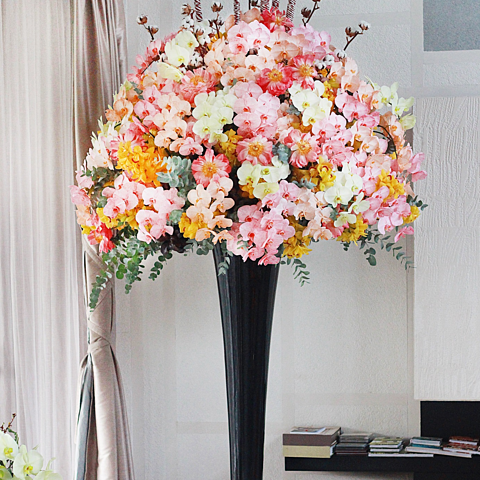 Được cắm bởi 3 nghệ nhân, bình hoa gồm 500 cành phi yến delphinium cần 6 người khiêng.