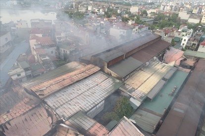Sau nhiều giờ bị cháy, khu nhà xưởng của Công ty bóng đèn phích nước Rạng Đông có nguy cơ đổ sập. Tường của một số hộ dân ở phố Hạ Đình (quận Thanh Xuân, Hà Nội) cũng nóng ran.