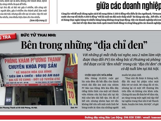 Liên quan đến loạt bài điều tra " Bức tử thai nhi " đăng tải trên Báo Lao Động ngày 17.6.2020, UBND thành phố Hà Nội đã ra quyết định tước giấy phép hoạt động, đình chỉ hoạt động khám bệnh chữa bệnh, đồng thời xử phạt vi phạm hành chính đối với phòng khám Phương Thanh do ông Võ Thủy Phương làm chủ - nơi được phóng sự điều tra của báo Lao Động chỉ ra là "điểm đen nhất trong các điểm đen" phá thai chui. Số tiền bị xử phạt gần 100 triệu đồng.