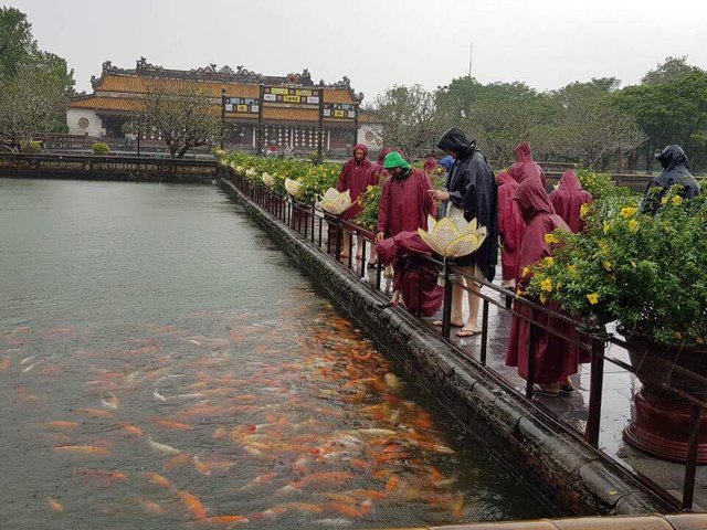 <strong> Nước lũ trên khu vực sông Hương mấy ngày nay dâng cao, tràn vào hồ Thái Dịch ở khuôn viên Đại nội Huế kéo theo cả đàn cá nhiều màu sắc.</strong>