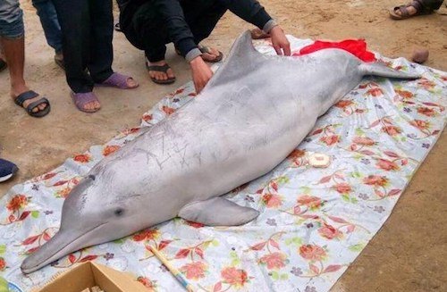 Con cá nặng khoảng 70kg, dài gần 2m dạt vào bờ biển ở huyện Nghi Lộc (Nghệ An) và được người dân chôn theo phong tục.