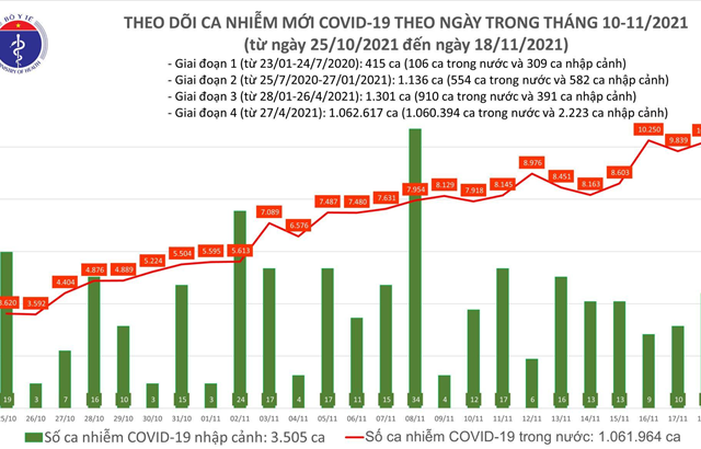 Bộ Y tế tối 18/11 công bố 10.223 ca nhiễm COVID-19 tại 60 tỉnh, thành phố, tăng 370 ca so với ngày trước đó.