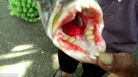 Cá hoàng đế có hàm răng như người gây sốc ở làng chài nhỏ ở Kimindores (Tây Papua, Indonesia) do một cậu học sinh mang về...