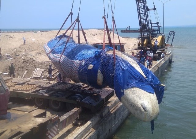 Cá voi dài 16 m, nặng 10 tấn chết trên biển được ngư dân đưa vào Phan Thiết an táng theo phong tục địa phương, trưa 17/4.