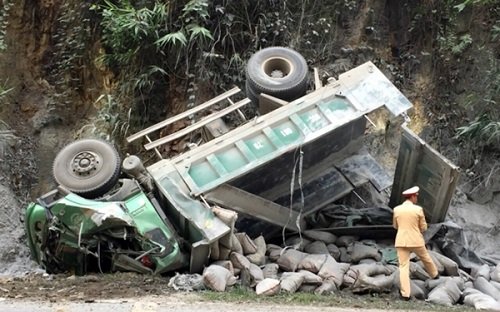 (NLĐO) - Xe đầu kéo chở hơn 40 tấn Alumin đến khúc cua "tử thần" thì mất lái lao qua bên trái đường, tông gãy một trụ điện rồi lật nhào trước cửa nhà dân.