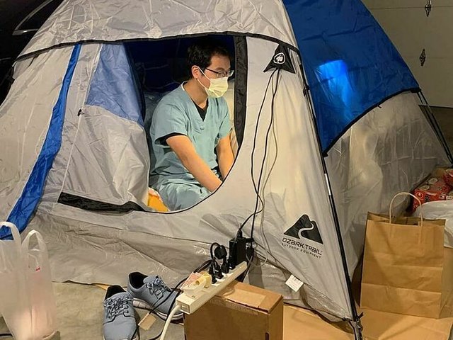 Là bác sĩ chuyên khoa phổi và tham gia tuyến đầu chống Covid-19, Timmy Cheng lo mình sẽ lây bệnh cho vợ con nên ngủ ngoài gara, từ ngày 14/3.