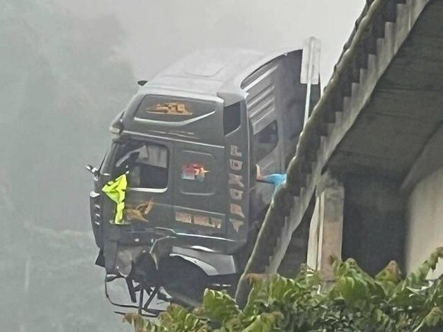 Xe đầu kéo đâm đổ lan can, treo lơ lửng trên cầu ở Lào Cai