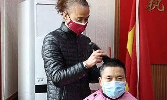 Du Zeyu cùng đồng nghiệp mang đồ nghề đến cắt tóc miễn phí cho cảnh sát huyện Diêm Đình, Tứ Xuyên khi các salon đóng cửa để tránh virus corona.