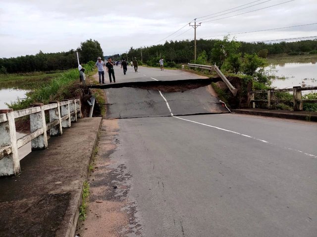 Tại hiện trường cầu Đôi bị gãy, hai mố cầu bị nứt toạc, các vết nứt trên đường toác rộng.