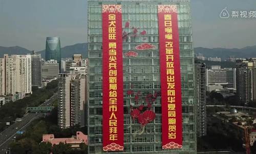 Mỗi câu đối dài 73 m, rộng 10 m, được treo dọc mặt trước một tòa nhà cao tầng ở thành phố Thâm Quyến.