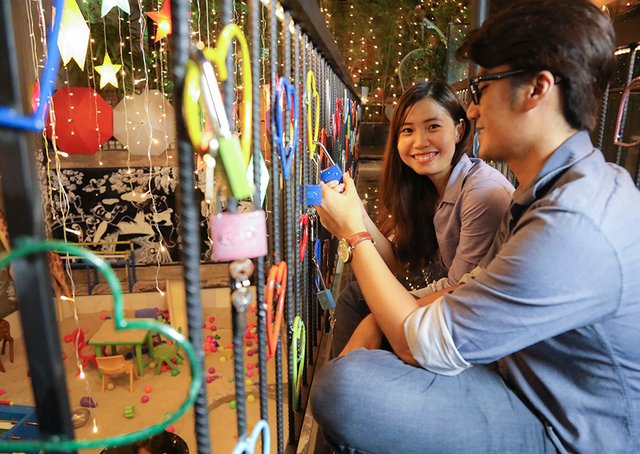 Chiếc cầu khoá tình yêu có chiều dài 14m nằm trong một quán cà phê có không gian thoáng mát ở quận 10.