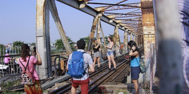 Ảnh: Bất chấp nguy hiểm, du khách leo vào đường sắt cầu Long Biên để "check-in"