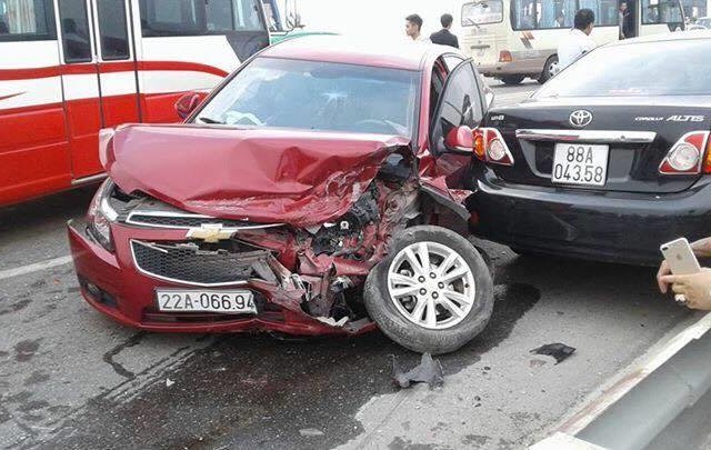 Xe ôtô màu đỏ di chuyển trên cầu Thăng Long đã lấn sang làn đường đối diện, bất ngờ đâm vào xe ôtô màu đen, chiếc xe khách khác tránh không kịp đã xảy ra va quệt.