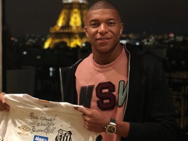Trên trang cá nhân, Kylian Mbappe bày tỏ hạnh phúc khi nhận áo đấu của CLB Santos kèm theo chữ ký từ “vua bóng đá” Pele.