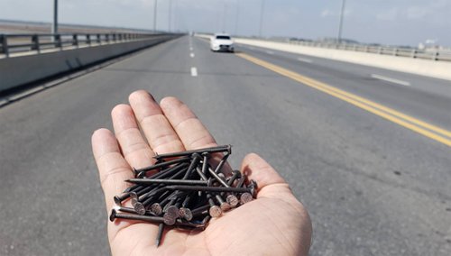 Dọc 5 km cầu ở Hải Phòng xuất hiện đinh ở cả 4 làn đường khiến đơn vị quản lý phải dùng xe lu lèn vì nhặt không xuể.