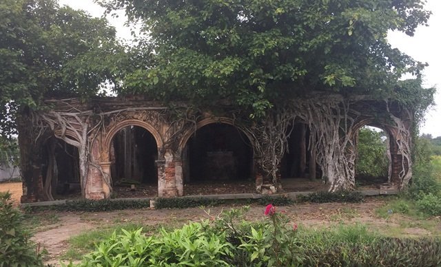 <strong>Trước mặt tiền điện thờ, 5 vòm cửa được rễ của 2 cây bồ đề tỏa rộng ra ôm trọn bức tường. Bên hông, một đoạn mảng tường đã cong nhưng nếu không có những cọng rễ của cây bồ đề ôm lấy chắc chắn sẽ đổ, kéo theo sự sụp đổ của ngôi đình. </strong>