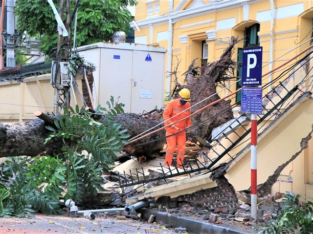 Rạng sáng 22-6, trận mưa lớn kéo dài nhiều giờ đồng hồ kèm theo gió giật mạnh đã khiến một cây cổ thụ trên phố Tràng Thi (quận Hoàn Kiếm) gãy ngang thân, đổ xuống đường, đè trúng hai ô tô.