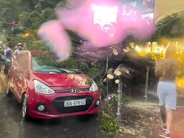 Cơn mưa giông lớn đã khiến cây bật rễ, ngã đổ ra đường và đè lên 2 ô tô đang di chuyển trên phố Kim Mã (quận Ba Đình, Hà Nội), may mắn không có người bị thương.