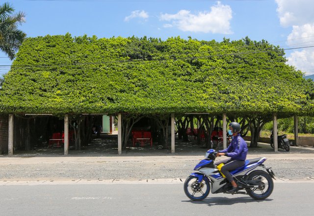 Chủ quán trồng các cây si lớn, tỉa thành hình ngôi nhà, không cần mái, tường, không lắp quạt nhưng luôn mát mẻ.