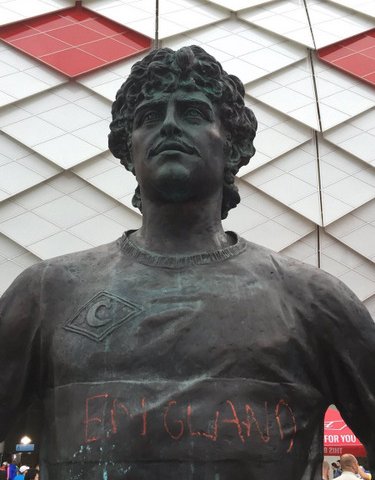 Một người hâm mộ bóng đá bị cảnh sát Moskva bắt trước trận Anh - Colombia vì viết dòng chữ "England" lên tượng cầu thủ Fyodor Cherenkov.