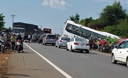 Đang thả dốc ở Lâm Đồng, tài xế xe khách trách đám đông vây đánh người trong ôtô 7 chỗ, nên lao xuống vệ đường.