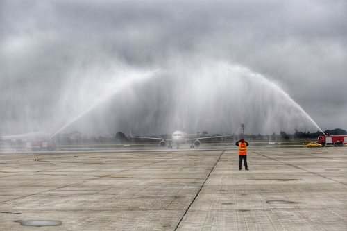 Máy bay vừa hạ cánh, hai xe cứu hỏa đã chạy ra phun nước xối xả khi các cầu thủ vẫn ở bên trong.