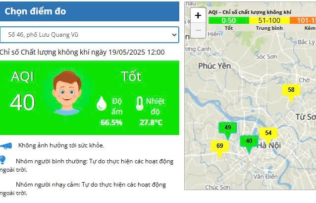 Ngày 19-5, chất lượng không khí trên địa bàn thành phố Hà Nội duy trì ở cấp độ 1 và 2. Chỉ số AQI lúc 6-10h có tỉ lệ ở mức tốt đạt 90%, từ 11h đến 14h, các khu vực gia tăng bụi mịn khiến tỉ lệ mức tốt giảm xuống còn 20%, tỉ lệ trung bình tăng lên 80%.