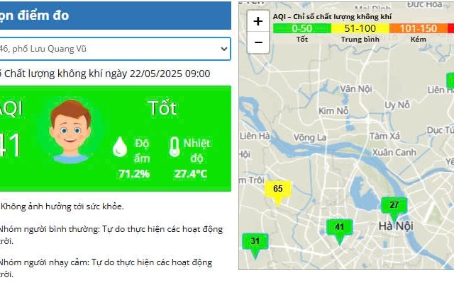 Sáng 22-5, chất lượng không khí nhiều khu vực trên địa bàn thành phố Hà Nội tiếp tục được cải thiện theo hướng tích cực. Trong đó, có 5 khu vực ở ngưỡng tốt, chỉ số AQI từ 27-46; 3 khu vực không khí ở ngưỡng trung bình, chỉ số AQI từ 54-65.