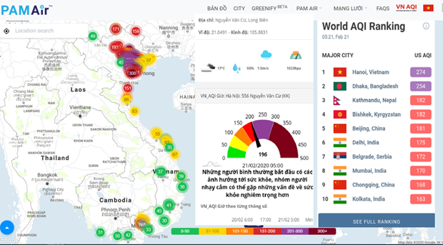 Theo ghi nhận của PAMAir, có tới trên 50 điểm quan trắc ở các tỉnh, TP phía Bắc như Hà Nội, Nam Định, Thái Bình, Vĩnh Phúc, Bắc Giang, Ninh Bình, Hưng Yên, Thái Nguyên ghi nhận chỉ số chất lượng không khí (AQI) ở ngưỡng tím, rất có hại cho sức khỏe.