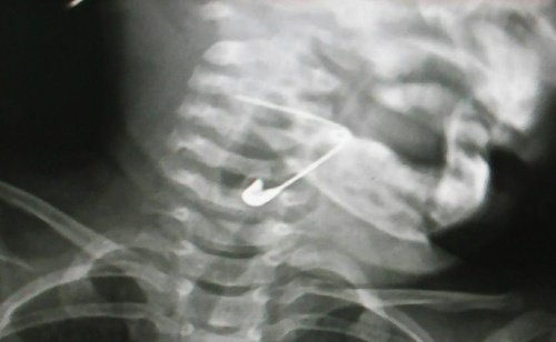 Bé 18 tháng tuổi nuốt kim băng mắc vào thanh quản
