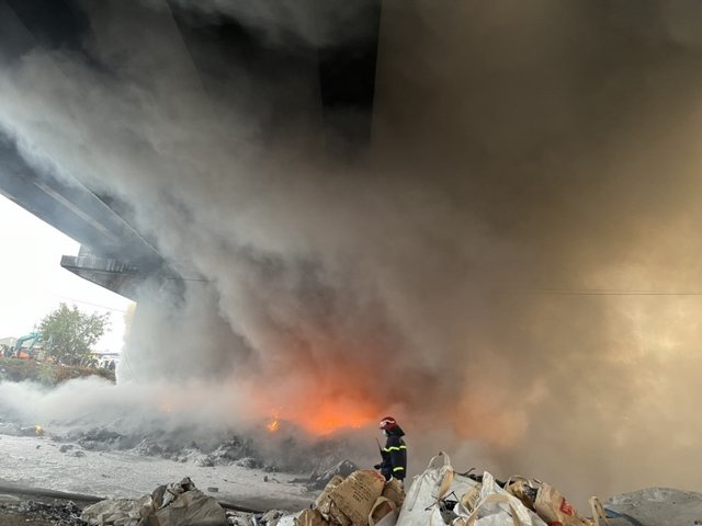Hà Nội: Cháy bãi phế liệu ở chân cầu Thăng Long, khói bốc mù mịt