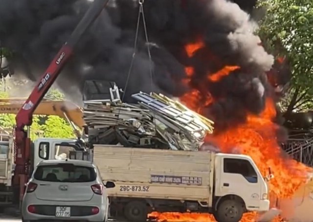 Hà Nội: Cháy bãi phế liệu nghi do hàn xì, 4 ô tô, xe máy bị thiêu rụi