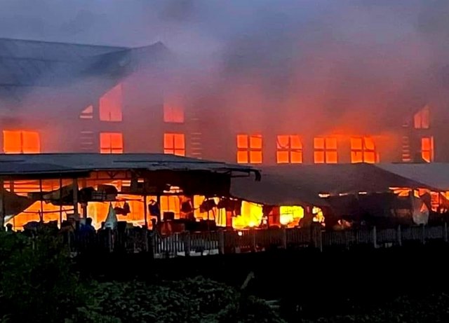 Ngọn lửa bùng cháy dữ dội khiến nhiều hàng hóa tại chợ Khe Tre (thị trấn Khe Tre, huyện Nam Đông, tỉnh Thừa Thiên Huế) bị thiêu rụi.