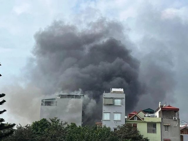 Hiện trường vụ cháy có nhiều giấy, nhựa nên ngọn lửa bùng phát lớn, khói bao trùm toàn bộ khu nhà chứa đồ cơ khí và phế liệu ở phường Trung Văn (Hà Nội).