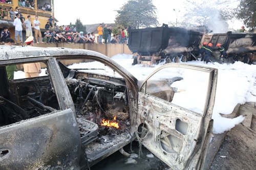 Sau tai nạn, ba xe tải và một xe bốn chỗ cháy trơ khung giữa đường phố ở Phú Thọ.